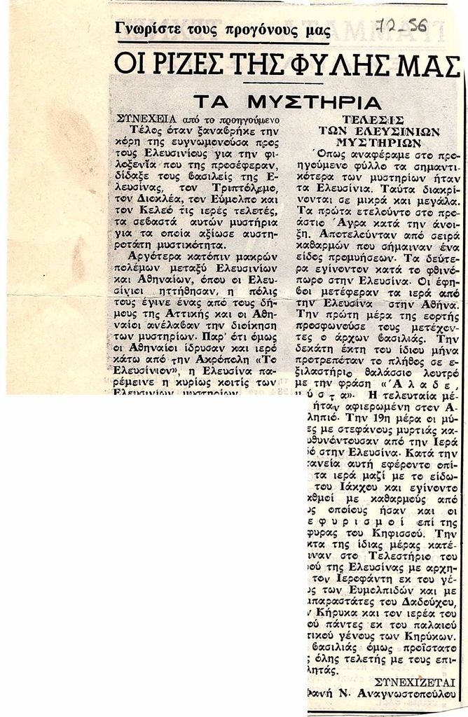Απόκομμα, χαρτί ακανόνιστου μεγέθους, στα ελληνικά. Δημοσίευση συνέχειας άρθρου το οποίο αναφέρεται στα Ελευσίνια Μυστήρια. Δίνονται λεπτομέρειες