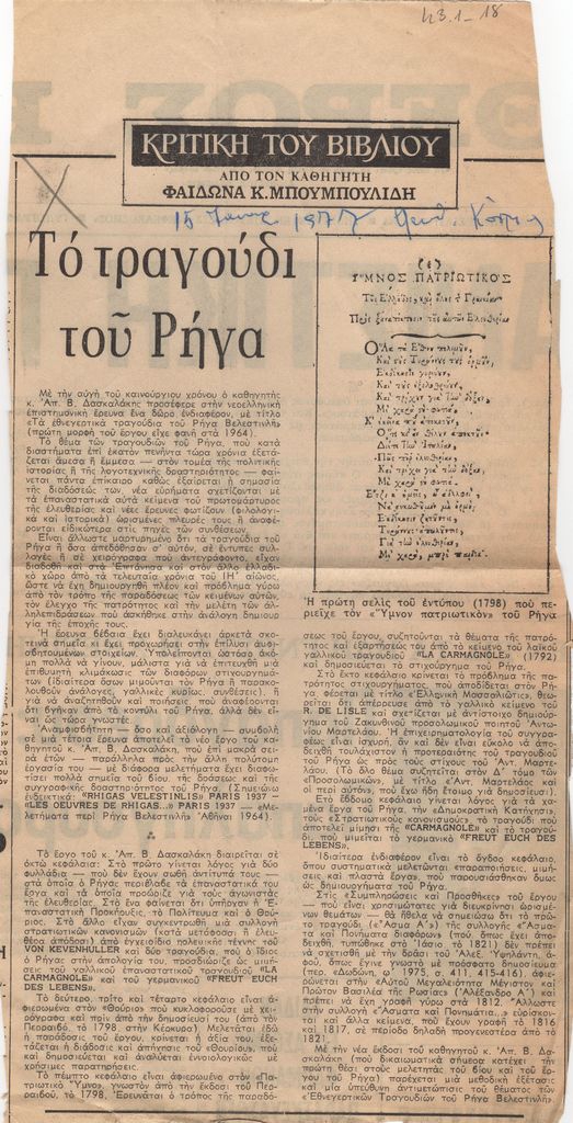 Απόκομμα, χαρτί, 31 x 16 εκ., στα ελληνικά, δημοσίευσης κριτικής έκδοσης του Απόστολου Δασκαλάκη με θέμα τα εθνεγερτικά τραγούδια του Ρήγα Βελεστινλή (Φεραίου). Εντάσσεται στη στήλη “Κριτική του βιβλίου”.
