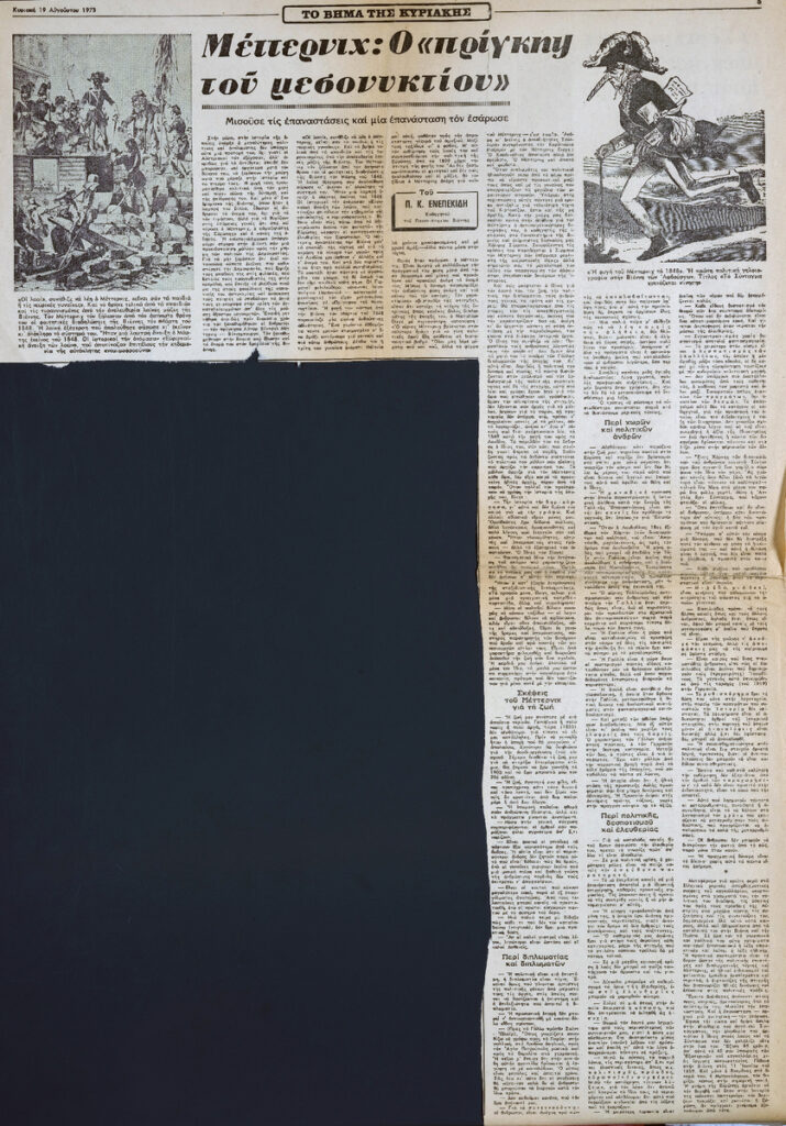 Απόκομμα της εφημερίδας “Το Βήμα” (19/08/1973), όπου δημοσιεύεται άρθρο για τον Αυστριακό διπλωμάτη Clemens von Metternich (Μέτερνιχ). Αναγράφονται πληροφορίες για τη ζωή του, για την διπλωματία, για την πολιτική που άσκησε, για τις ιδέες του και τον ρόλο που έπαιξε στην Ελληνική Επανάσταση. Δίνονται αποσπάσματα δηλώσεών του.