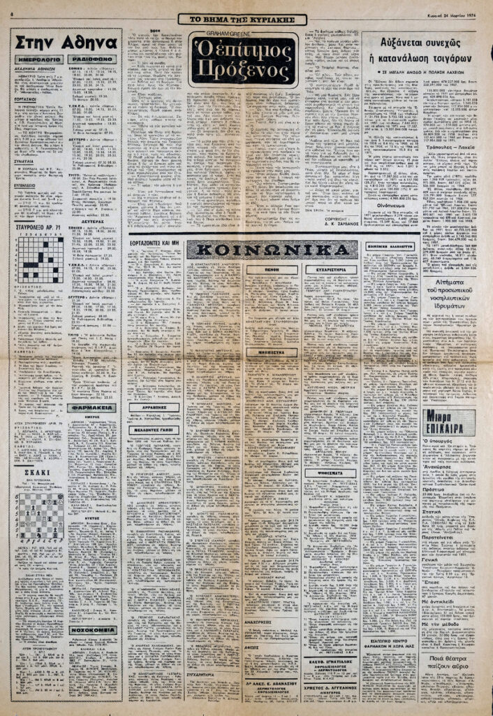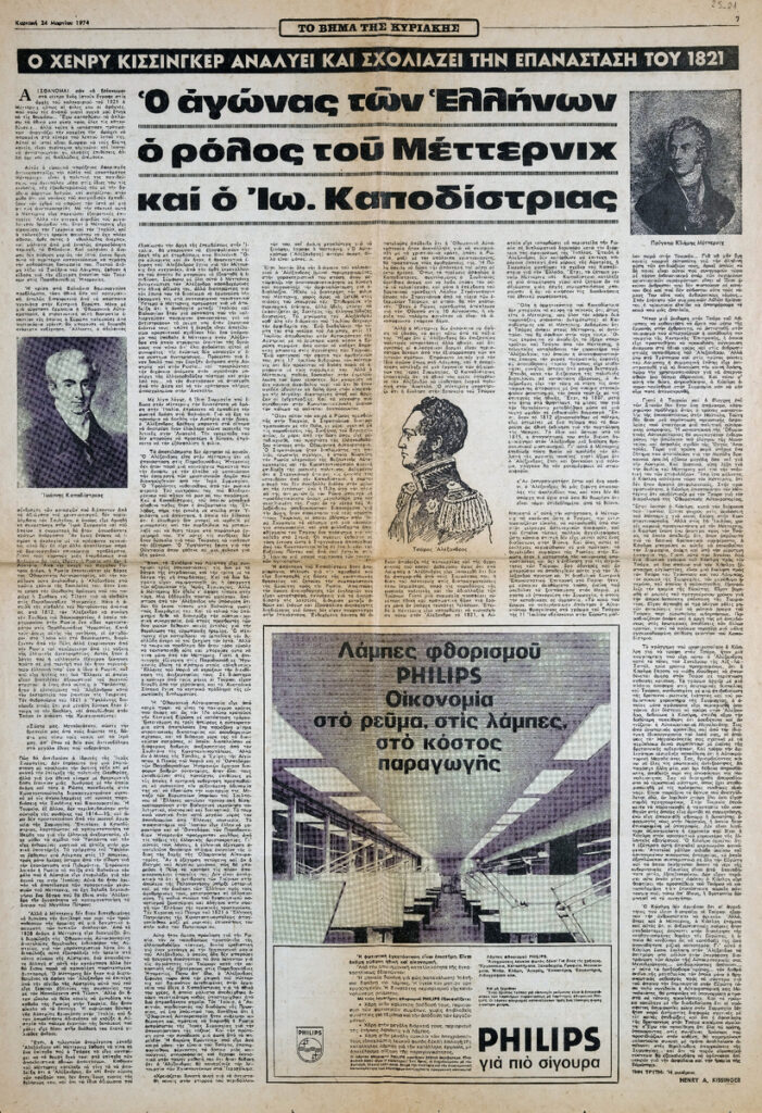 Απόκομμα της εφημερίδας “Το Βήμα” (24/03/1974), δημοσίευσης άρθρου το οποίο αναφέρεται στο ρόλο που έπαιξαν οι Clement von Metternich και Ιωάννης Καποδίστριας στον ελληνικό απελευθερωτικό Αγώνα.