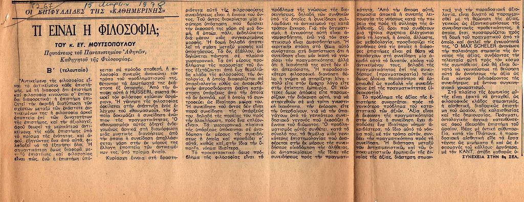 Απόκομμα, χαρτί, 13×32 εκ., στα ελληνικά. Δημοσίευση άρθρου το οποίο αναφέρεται στην φιλοσοφία. Γίνεται μια προσπάθεια ερμηνείας του όρου.