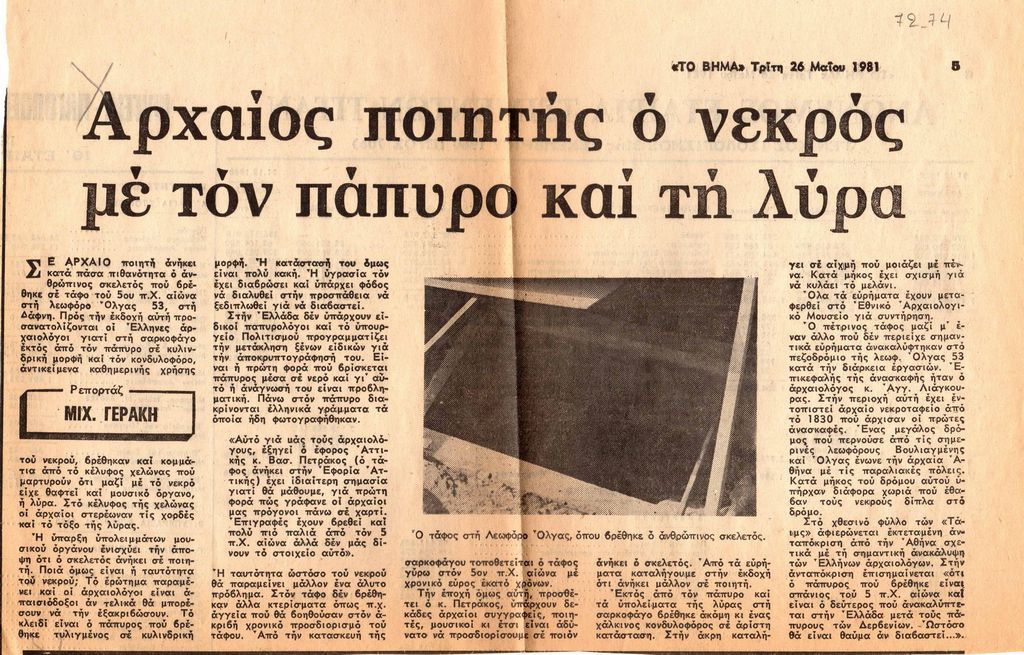 Απόκομμα, χαρτί, 17×27 εκ., στα ελληνικά. Δημοσίευση άρθρου το οποίο αναφέρεται στην ανακάλυψη ανθρώπινου σκελετού στην Αθήνα. Δίνονται λεπτομέρειες για τα πορίσματα των ευρημάτων, σύμφωνα με τα οποία ο σκελετός ανήκει σε αρχαίο ποιητή.