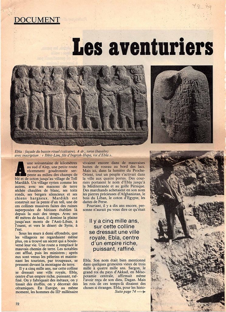 Απόκομμα, χαρτί, 4 φφ, 28×20 εκ., στα γαλλικά. Δημοσίευση άρθρου το οποίο αναφέρεται στα ευρήματα ανασκαφών που πραγματοποιήθηκαν στην Ebla, βασίλειο της Συρίας. Δίνονται λεπτομέρειες.