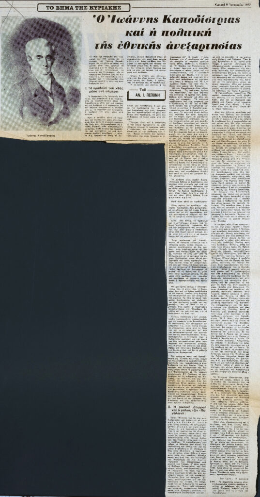 Απόκομμα της εφημερίδας “Το Βήμα” (09/01/1977), δημοσίευσης άρθρου το οποίο αναφέρεται στην πολιτική του Ιωάννη Καποδίστρια.