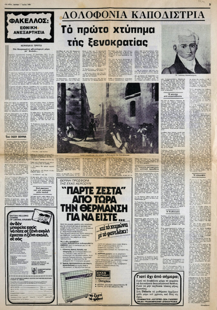 Απόκομμα της εφημερίδας “Τα Νέα” (01/06/1981), δημοσίευσης κειμένου αναφερόμενου στην δολοφονία του Ιωάννη Καποδίστρια. Αναγράφονται πληροφορίες για τον σχεδιασμό, την υλοποίησή της και τη σύλληψη του δολοφόνου.