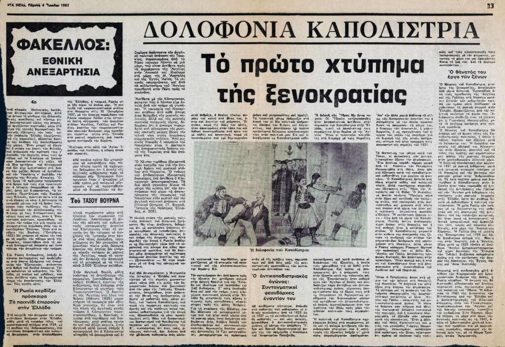 Απόκομμα της εφημερίδας “Τα Νέα” (04/06/1981), δημοσίευσης συνέχειας άρθρου το οποίο αναφέρεται στην δολοφονία του Ιωάννη Καποδίστρια. Αναγράφονται λεπτομέρειες για την αντίδραση στην πολιτική του.