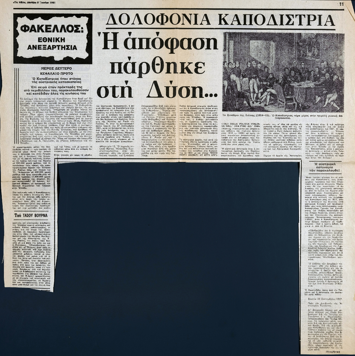 Απόκομμα της εφημερίδας “Τα Νέα” (08/06/1981), δημοσίευσης συνέχειας άρθρου το οποίο αναφέρεται στην δολοφονία του Ιωάννη Καποδίστρια. Εξηγείται ο ρόλος που έπαιξαν οι Αυστριακές δυνάμεις.