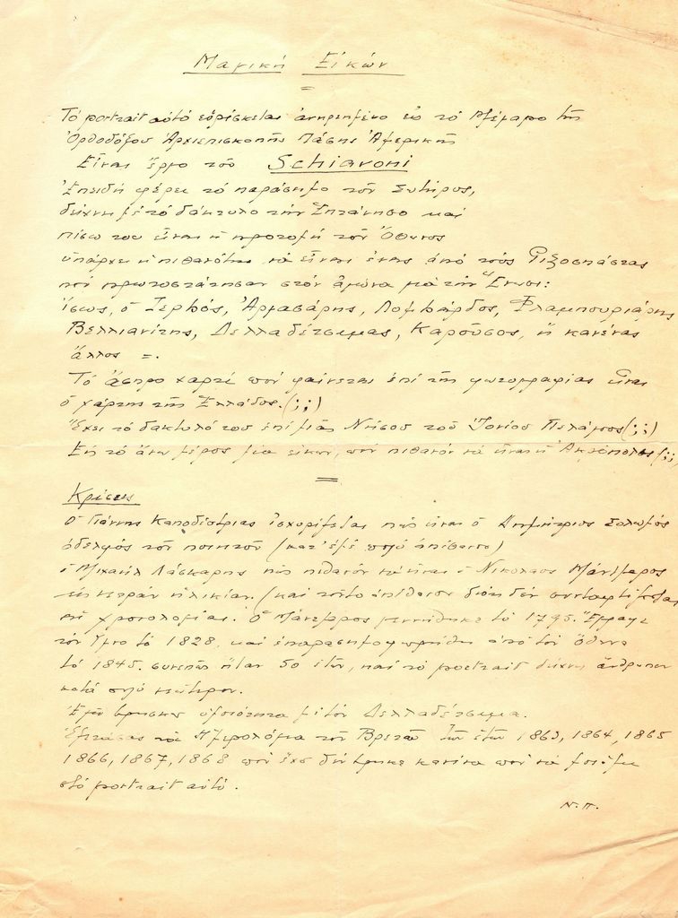 Χειρόγραφο κείμενο, χαρτί, 28 x 20.5 εκ., στα ελληνικά. Δίνονται πληροφορίες για έργο, πίνακα του ιταλού καλλιτέχνη Schiavoni.
