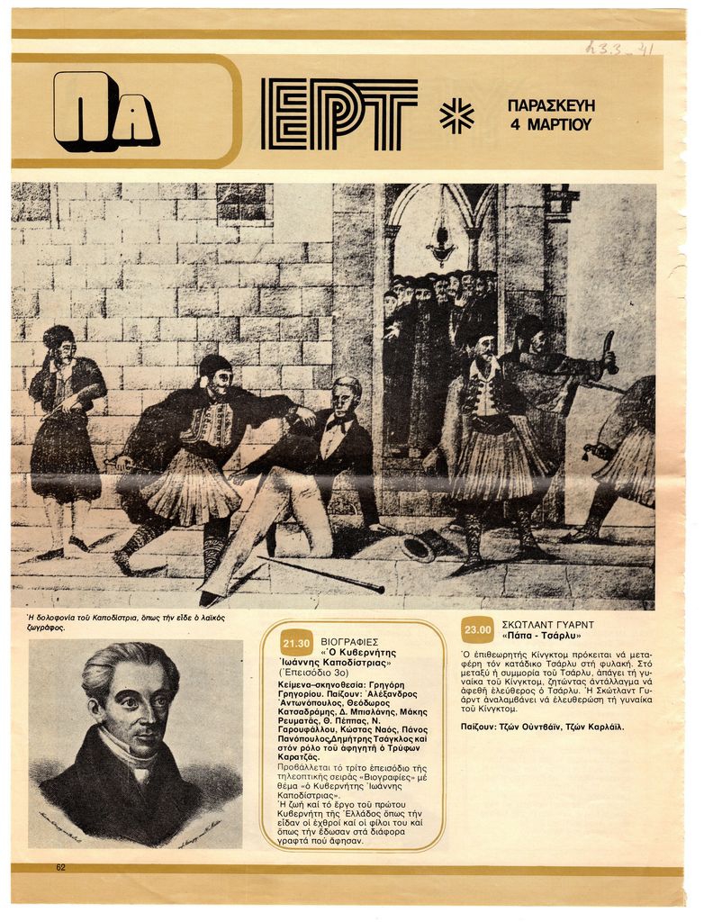 Απόκομμα περιοδικού (04/03/19xx), χαρτί, 30 x 22,5 εκ., στα ελληνικά, δημοσίευσης αναφερόμενης σε προβολή τηλεοπτικής σειράς με τίτλο “Βιογραφίες”. Το αναφερόμενο επεισόδιο είναι αφιερωμένο στον Ιωάννη Καποδίστρια. Δίνονται λεπτομέρειες για το περιεχόμενο και τους συντελεστές.