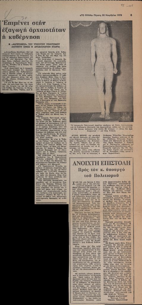 Απόκομμα, χαρτί, στα ελληνικά. Δημοσίευση άρθρου το οποίο αναφέρεται στην απόφαση του Υπουργείου Πολιτισμού να επιτρέψει την απομάκρυνση έργων αρχαιοελληνικής τέχνης από τις συλλογές των μουσείων της χώρας, προκειμένου αυτά να εκτεθούν σε εκθέσεις στο εξωτερικό. Σχολιάζονται οι αντιδράσεις που προκάλεσε η άποψη αυτή και δημοσιεύεται επιστολή προς τον Υπουργό Πολιτισμού.