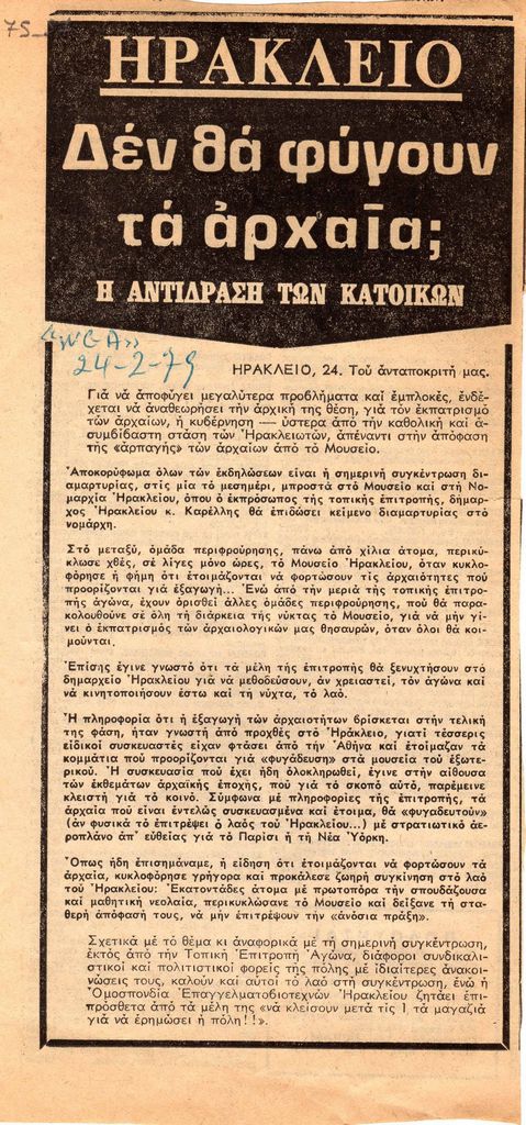 Απόκομμα, χαρτί, 23×11 εκ., στα ελληνικά. Δημοσίευση άρθρου το οποίο αναφέρεται σε αντιδράσεις των διοικητικών και πολιτιστικών φορέων του Ηράκλειου Κρήτης σχετικά με την απομάκρυνση έργων αρχαιοελληνικής τέχνης του αρχαιολογικού μουσείου της πόλης, προκειμένου να παρουσιαστούν σε εκθέσεις στο εξωτερικό.