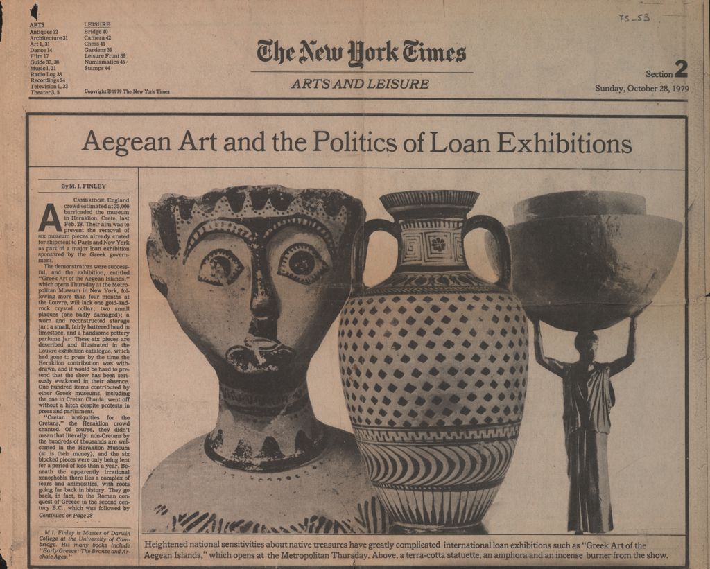 Απόκομμα, χαρτί, 2 φφ, 30×37 και 55×14 εκ., στα αγγλικά. Δημοσίευση άρθρου το οποίο αναφέρεται σε έκθεση αρχαιοελληνικής τέχνης, η οποία διοργανώνεται στο Μητροπολιτικό Μουσείο της Νέας Υόρκης. Δίνονται λεπτομέρειες για το περιεχόμενο της έκθεσης και την πολιτική δανεισμού που ακολουθείται.