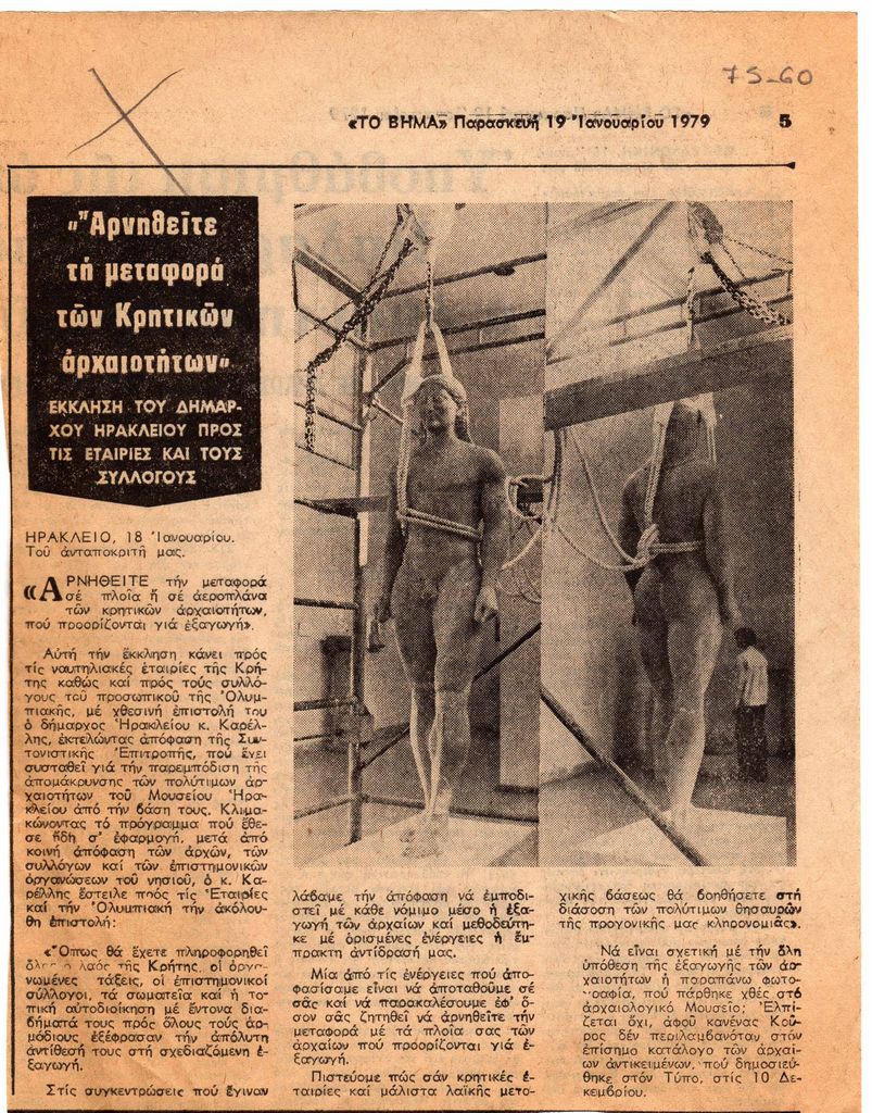Απόκομμα, χαρτί, 21×16 εκ., στα ελληνικά. Δημοσίευση άρθρου το οποίο αναφέρεται σε έκκληση του δημάρχου του Ηράκλειου Κρήτης να μην επιτραπεί η αφαίρεση έργων της συλλογής του αρχαιολογικού μουσείου της πόλης, ώστε αυτά να παρουσιαστούν σε εκθέσεις στο εξωτερικό. Δίνονται λεπτομέρειες.