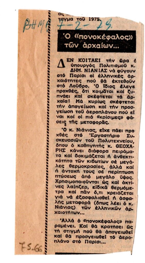 Απόκομμα, χαρτί, 13×7 εκ., στα ελληνικά. Δημοσίευση άρθρου το οποίο αναφέρεται στην απόφαση απομάκρυνσης έργων αρχαιοελληνικής τέχνης από τις συλλογές μουσείων της χώρας, προκειμένου αυτά να προβληθούν σε εκθέσεις στο εξωτερικό.