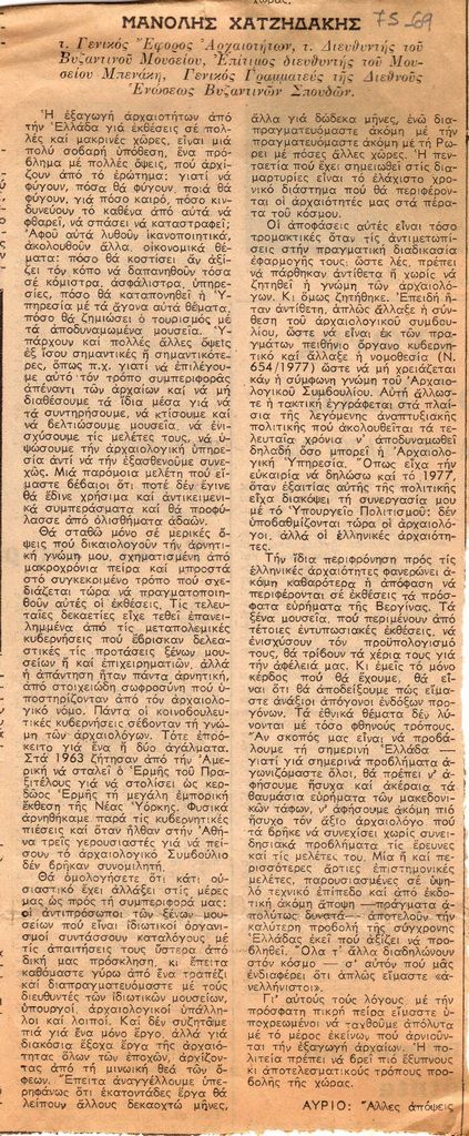 Απόκομμα, χαρτί, 25.5×11 εκ., στα ελληνικά. Δημοσίευση άρθρου, στο οποίο μεταφέρονται κρίσεις του Μανόλη Χατζηδάκη σχετικά με την απομάκρυνση έργων αρχαιοελληνικής τέχνης από τις συλλογές των μουσείων της χώρας, προκειμένου αυτά να προβληθούν στο εξωτερικό.