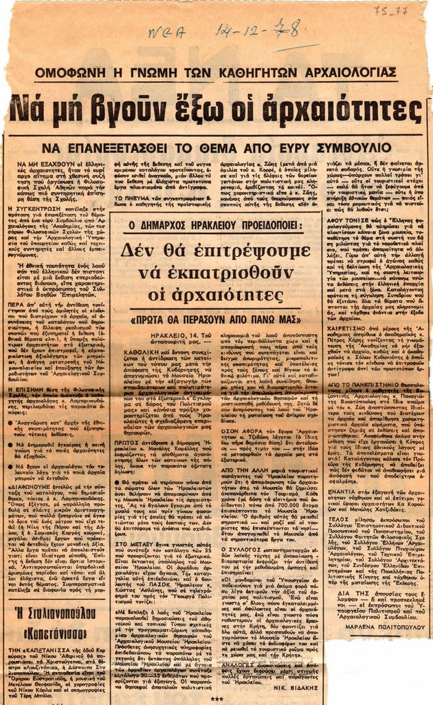 Απόκομμα, χαρτί, 33×21 εκ., στα ελληνικά. Δημοσίευση άρθρου το οποίο αναφέρεται στην αντίδραση αρχαιολόγων για την απόφαση μετακίνησης έργων αρχαίας τέχνης από τις συλλογές μουσείων της χώρας, προκειμένου αυτά να παρουσιαστούν σε εκθέσεις στο εξωτερικό.