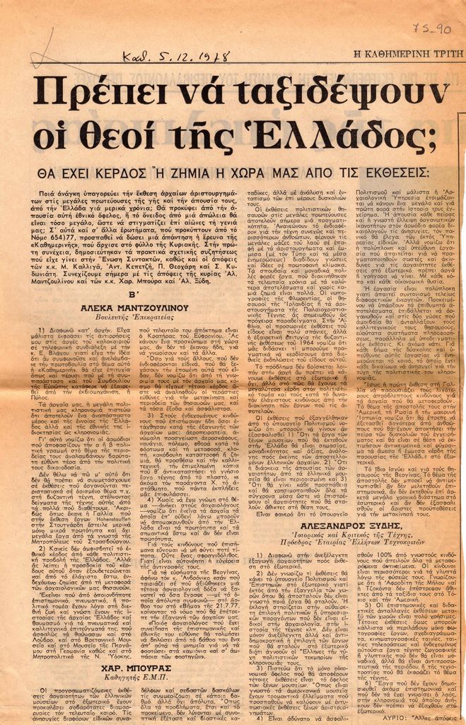 Απόκομμα, χαρτί, 34×22 εκ., στα ελληνικά. Δημοσίευση έρευνας του εντύπου, στην οποία μεταφέρονται κρίσεις των Α. Μαντζουλίνου, Χ. Μπούρα και Α. Ξύδη, σχετικά με τα πλεονεκτήματα και μειονεκτήματα απομάκρυνσης αρχαιοτήτων από τις συλλογές μουσείων της χώρας προκειμένου αυτά να παρουσιαστούν σε εκθέσεις στο εξωτερικό.
