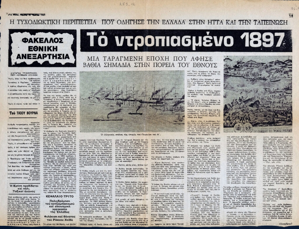 Απόκομμα της εφημερίδας “Τα Νέα” (16/07/1981), δημοσίευσης αφιερώματος του εντύπου στην ελληνική ήττα του 1897. Στο παρόν δίνονται ιστορικά στοιχεία για την πολιτική Τρικούπη, την οικονομική χρεοκοπία και τη φυλάκιση και θάνατο του Ρόκκου Χοϊδά.