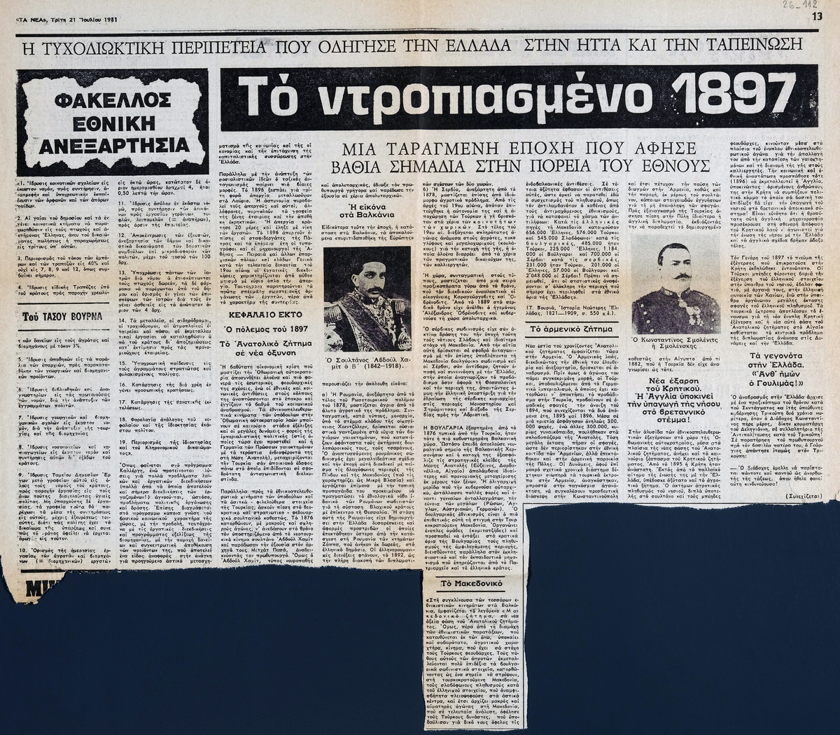 Απόκομμα εφημερίδα “Τα Νέα” (21/07/1981), δημοσίευσης αφιερώματος του εντύπου στην ελληνική ήττα του 1897. Στο παρόν δίνονται ιστορικά στοιχεία για τον πόλεμο, για την όξυνση στην Ανατολή, την κατάσταση στα Βαλκάνια και την κοινωνική κατάσταση στην Κρήτη.