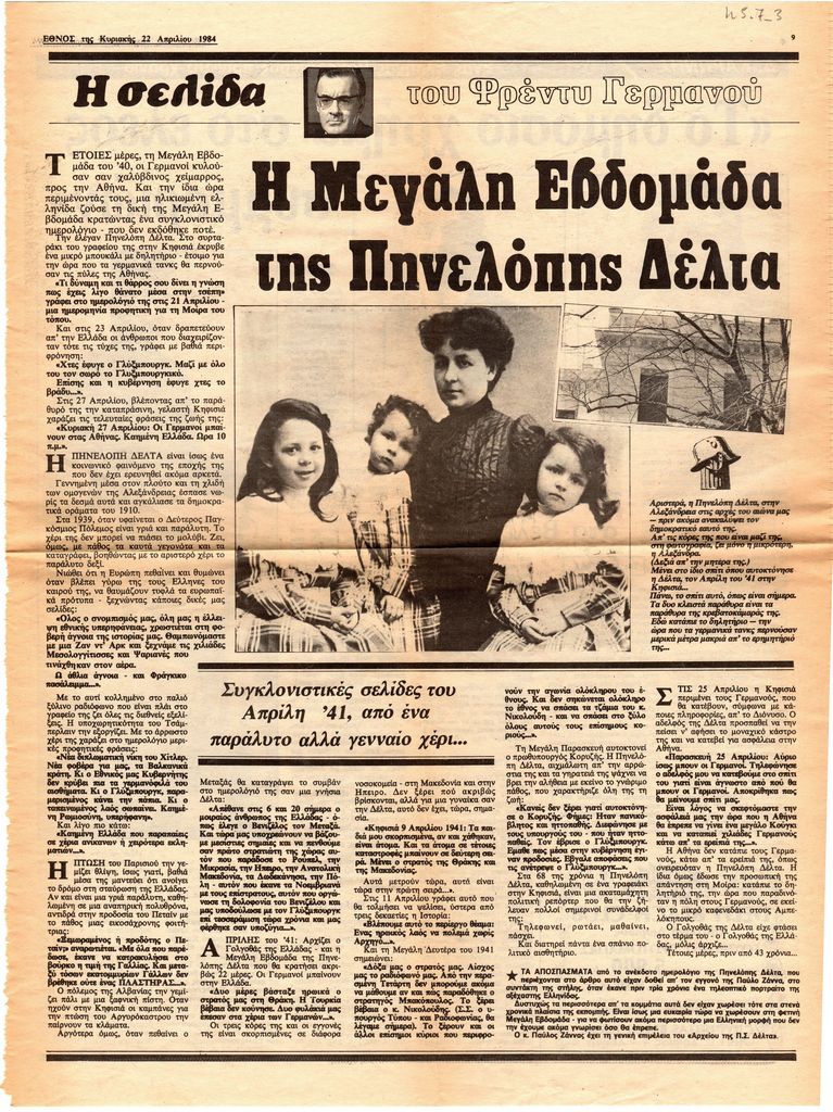 Απόκομμα, χαρτί, 37×29 εκ., στα ελληνικά, δημοσίευσης άρθρου στο οποίο μεταφέρονται τμήματα του προσωπικού ημερολογίου της Πηνελόπης Δέλτα, στα οποία αναγράφονται σκέψεις της για την πολιτική της χώρας τον Απρίλιο 1941.