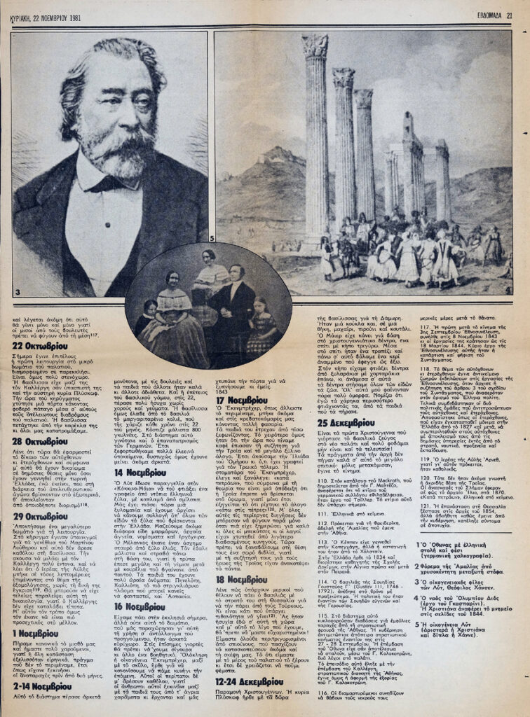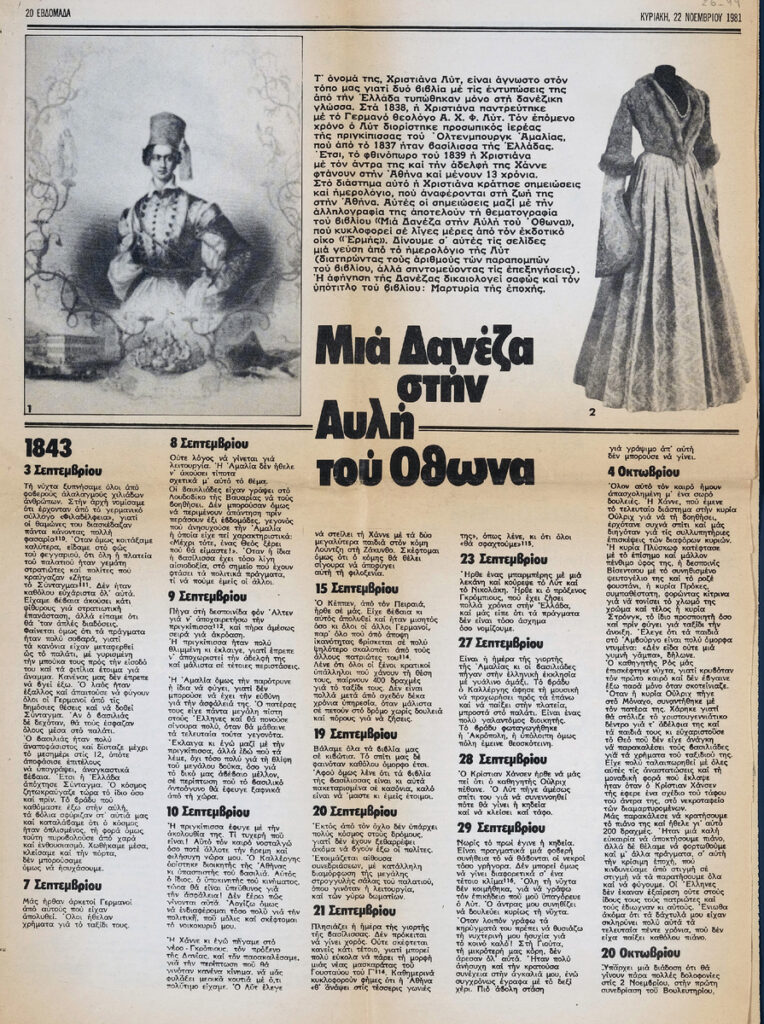 Απόκομμα εφημερίδας (22/11/1981), δημοσίευσης αποσπασμάτων ημερολογίου της Χριστιάνας Λυτ (Christiane Luth), στα οποία αφηγείται τη ζωή της στην αυλή του Όθωνα, με αφορμή την κυκλοφορία του κειμένου σε βιβλίο με τίτλο “Μια Δανέζα στην αυλή του Όθωνα” από τις εκδόσεις ‘Ερμής’.