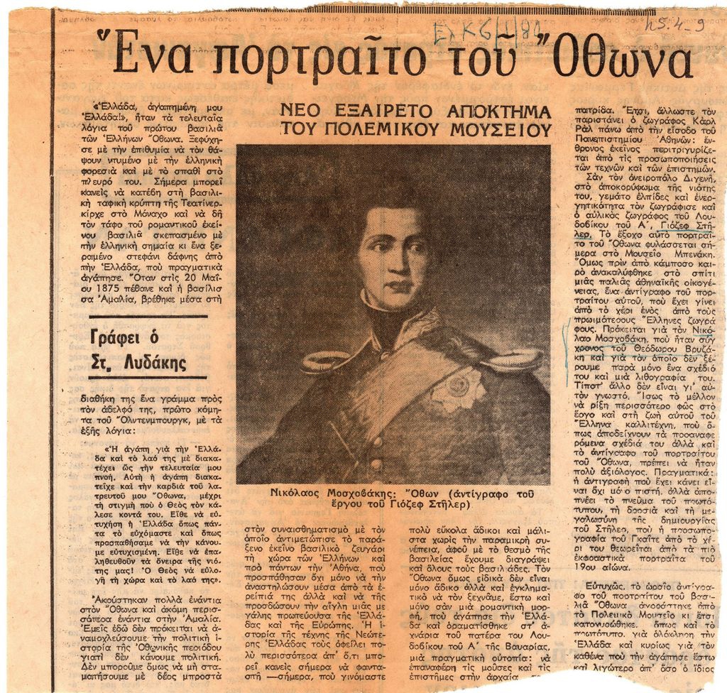 Απόκομμα, χαρτί, 21×21 εκ., στα ελληνικά, δημοσίευσης άρθρου το οποίο αναφέρεται σε πορτρέτο του Όθωνα, που φιλοτέχνησε ο Νικόλαος Μοσχοβάκης. Πρόκειται για αντίγραφο πορτρέτου του Γιόζεφ Στήλερ, που φυλάσσεται στο Μουσείο Μπενάκη. Στο άρθρο σχολιάζεται η αγάπη του Όθωνα για την Ελλάδα.
