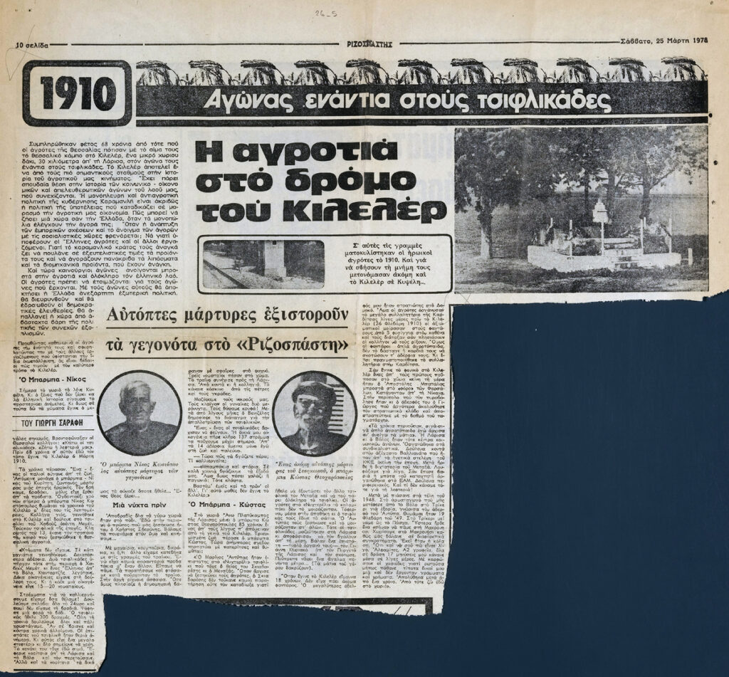 Απόκομμα της εφημερίδας “Ριζοσπάστης” (25/03/1978), δημοσίευσης άρθρου το οποίο μεταφέρει ενθυμήματα συμμετεχόντων στην εξέγερση του Κιλελέρ τον Μάρτιο 1910, με αφορμή την συμπλήρωση 68 χρόνων.