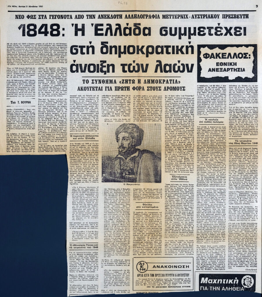Απόκομμα της εφημερίδας “Τα Νέα” (03/08/1981), δημοσίευσης άρθρου το οποίο αναφέρεται στην κοινωνική και πολιτική κατάσταση στην Ελλάδα το 1848.