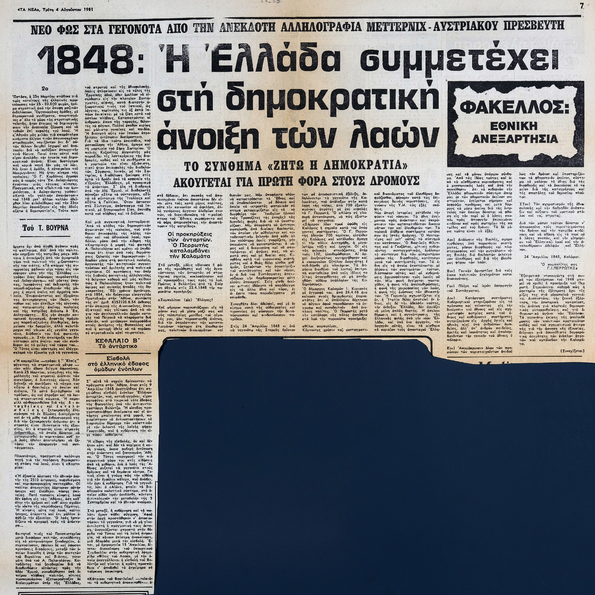 Απόκομμα της εφημερίδας “Τα Νέα” (04/08/1981), δημοσίευσης άρθρου το οποίο αναφέρεται στην κοινωνική και πολιτική κατάσταση στην Ελλάδα το 1848.