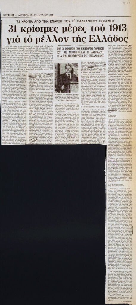 Απόκομμα εφημερίδας (16/06/1985), δημοσίευσης άρθρου το οποίο αναφέρεται στους Βαλκανικούς Πολέμους 1912-1913. Δίνονται ιστορικά στοιχεία για τα γεγονότα.