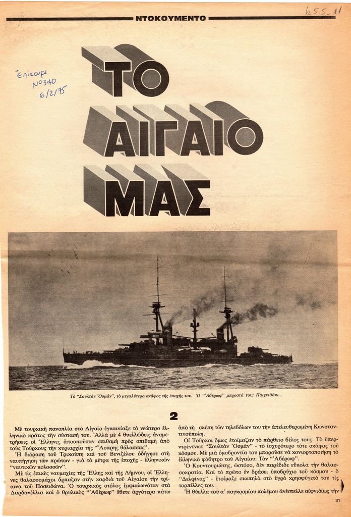 Απόκομμα, χαρτί, 4 φφ, 34×23 εκ., στα ελληνικά, δημοσίευσης άρθρου στο οποίο δίνονται ιστορικά στοιχεία για γεγονότα, πολεμικές συρράξεις μεταξύ Ελλάδας και Τουρκίας που οδήγησαν στους Βαλκανικούς Πολέμους. Σχολιάζονται ιδιαίτερα ο ρόλος του Αιγαίου και συγκρούσεις που πραγματοποιήθηκαν σε αυτό.