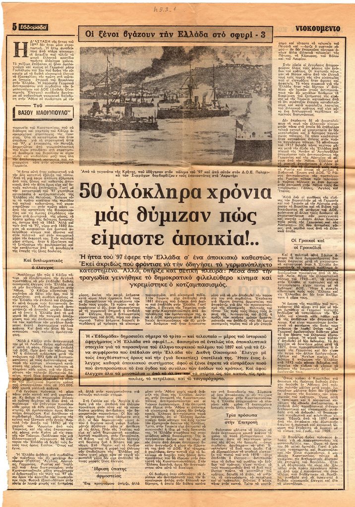 Απόκομμα, χαρτί, 43×30 εκ., στα ελληνικά, δημοσίευσης άρθρου, στο οποίο δίνονται ιστορικά στοιχεία για τα παρασκήνια του ελληνοτουρκικού πολέμου 1897, την στάση των ξένων δυνάμεων απέναντι στην χώρα και την επιβολή του δημοσιονομικού ελέγχου.
