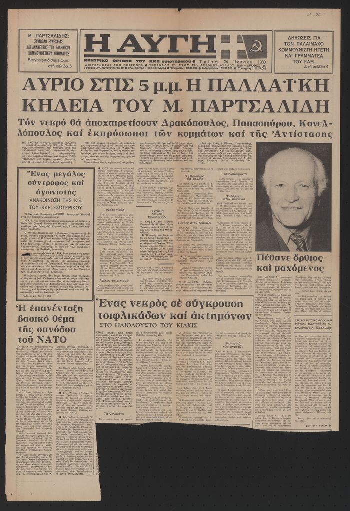 Απόκομμα, έντυπο, στα ελληνικά, χαρτί, διπλής όψης, 63×43 εκ. Στο ίδιο απόκομμα: πολιτική επικαιρότητα.