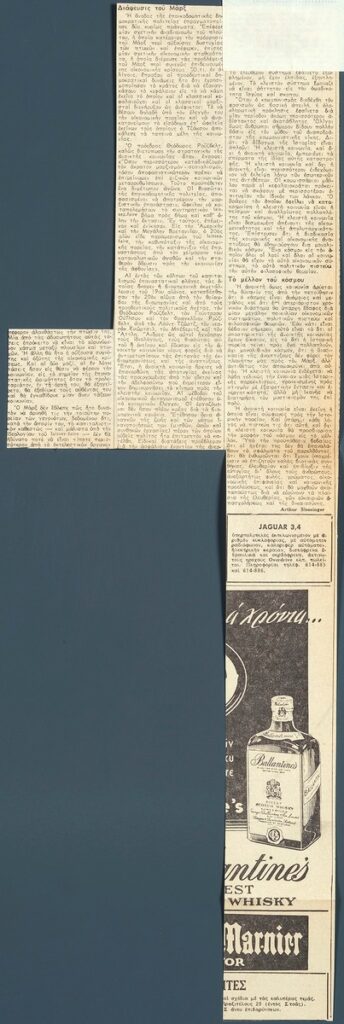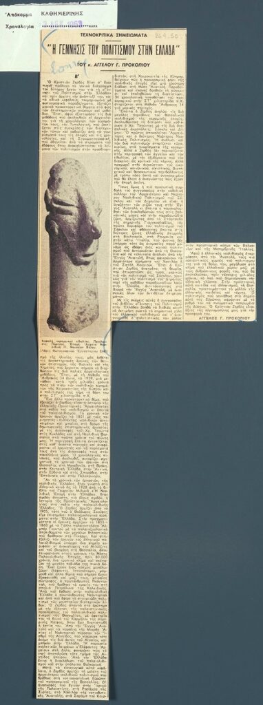 Απόκομμα της εφημερίδας “Η Καθημερινή” (03/12/1963), δημοσίευσης συνέχειας κριτικής για την κυκλοφορία βιβλίου του Christian Zervos (Κριστιάν Ζερβός), με θέμα τον ελληνικό πολιτισμό. Εντάσσεται στη στήλη του εντύπου “Τεχνοκριτικά Σημειώματα”.