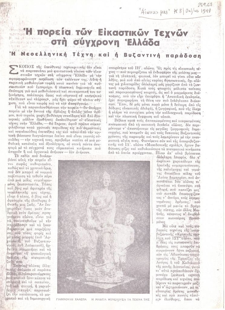 Φωτοαντίγραφο, χαρτί, 4 φφ, 30×21 εκ., στα ελληνικά, δημοσίευσης άρθρου στο οποίο εξετάζεται η σύνδεση της νεοελληνικής τέχνης με την βυζαντινή παράδοση.