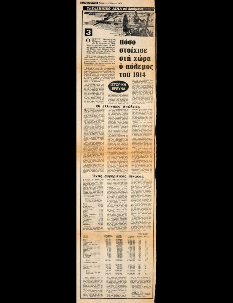 Απόκομμα της εφημερίδας “Ελευθεροτυπία” (10/03/1976), δημοσίευσης έρευνας του εντύπου στην οποία δίνονται ιστορικά στοιχεία και σχολιάζεται η συμμετοχή της Ελλάδας στον Πρώτο Παγκόσμιο Πόλεμο. Δίνεται ένας πίνακας στον οποίο καταγράφονται οι απώλειες ανθρώπων στις συμμετέχουσες χώρες.