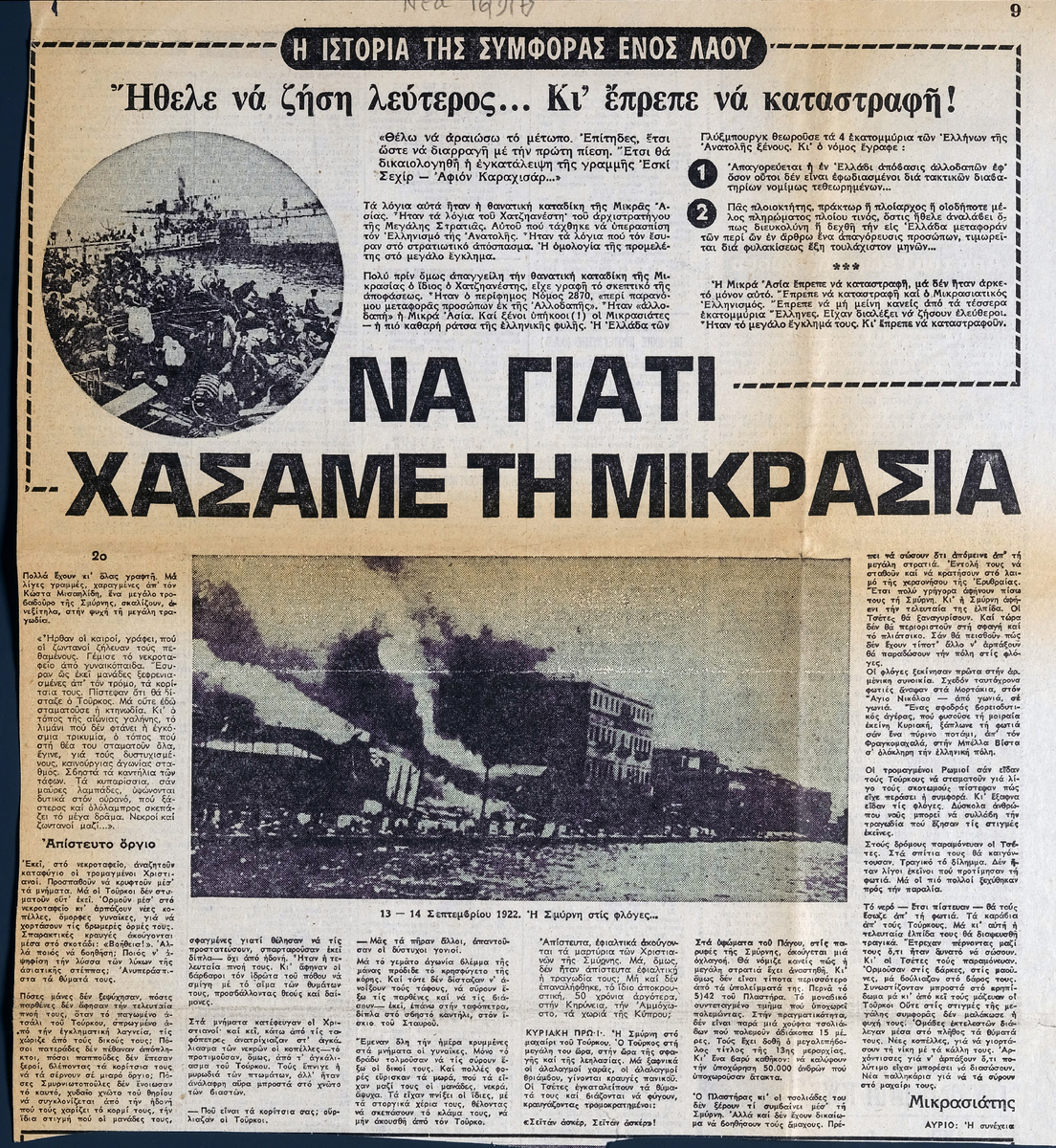 Απόκομμα της εφημερίδας “Τα Νέα” (16/09/1975), δημοσίευσης αφιερώματος του εντύπου στην Μικρασιατική Καταστροφή. Αναγράφονται μαρτυρίες από τη σφαγή της Σμύρνης.