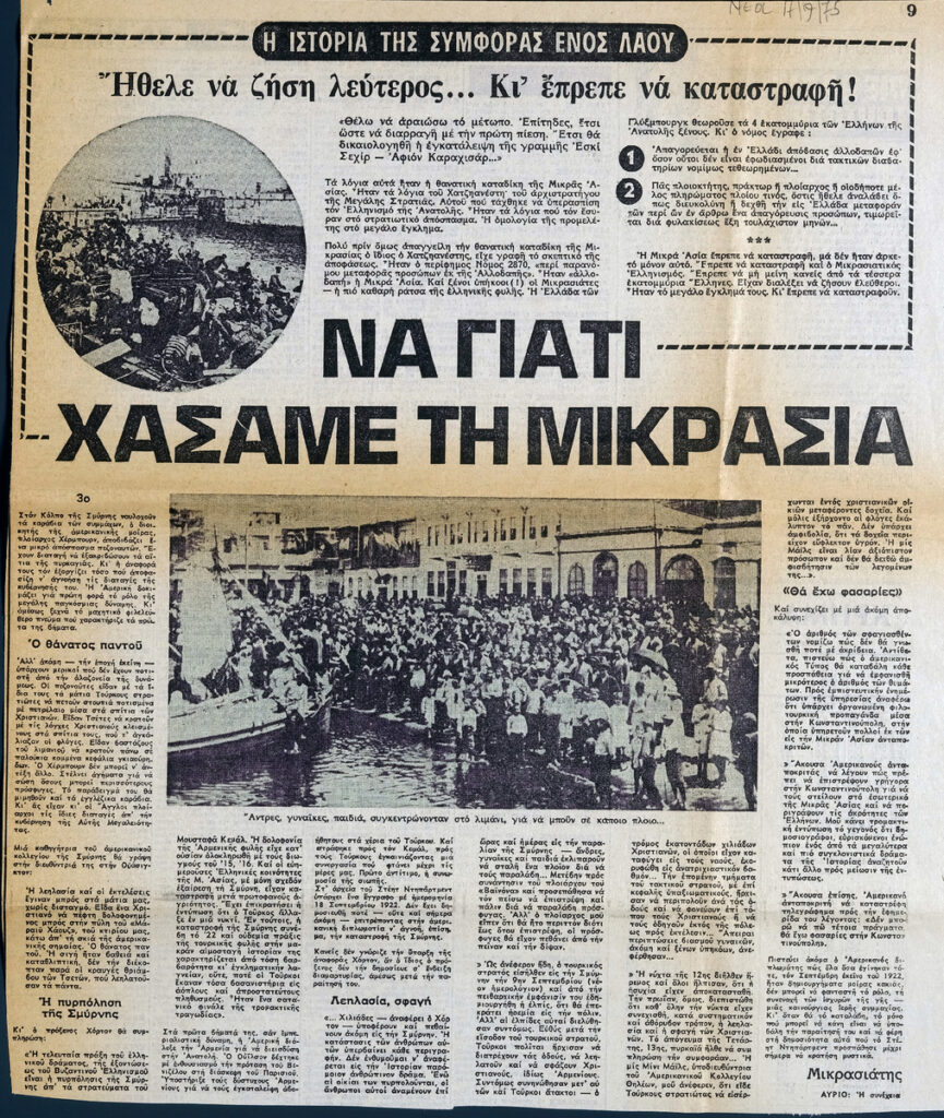 Απόκομμα της εφημερίδας “Τα Νέα” (17/09/1975), δημοσίευσης αφιερώματος του εντύπου στην Μικρασιατική Καταστροφή. Αναγράφονται μαρτυρίες από τη σφαγή της Σμύρνης.
