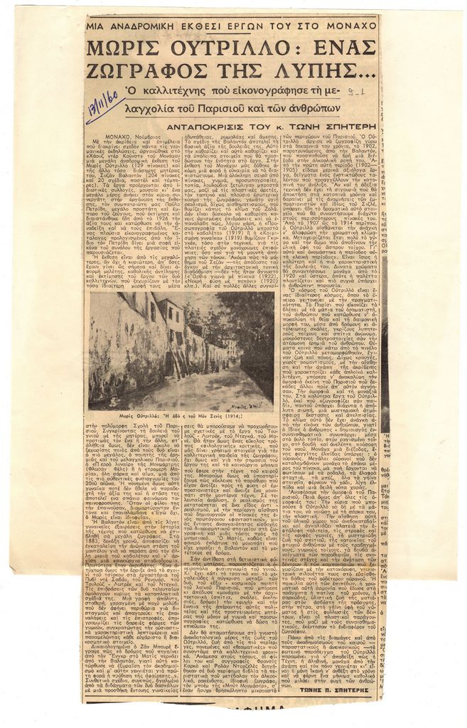 Απόκομμα, έντυπο, χαρτί, 34,0×15,0 εκ., όπου δημοσιεύεται, στα ελληνικά, άρθρο του Τώνη Σπητέρη για τον Γάλλο ζωγράφο Maurice Utrillo με αφορμή την αναδρομική έκθεση έργων του και έργων της μητέρας του Suzanne Valadon, που πραγματοποιήθηκε στο Μόναχο το 1960. Επάνω, επιγραφή.