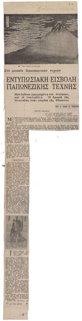 Απόκομμα, έντυπο, χαρτί, 2 τμήματα, 63,0×15,0 εκ. και 25,0×11,4 εκ., όπου δημοσιεύεται, στα ελληνικά, κριτική του Τώνη Σπητέρη για την έκθεση ιαπωνικής τέχνης Ουκίγιο-Ε, που πραγματοποιήθηκε στο Παρίσι το 1966. Επάνω, επιγραφή με τα στοιχεία της δημοσίευσης.