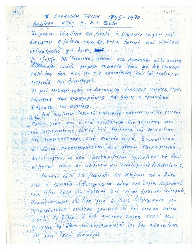 Κείμενο, χειρόγραφο, στα ελληνικά, χαρτί, 8 φφ., 29,0×21,5 εκ. Προσχέδιο άρθρου του Τώνη Σπητέρη με θέμα την εξέλιξη της Ελληνικής Τέχνης κατά την περίοδο 1945-1970 ως απάντηση σε προηγούμενο δημοσίευμα του Α. Γ. Ξύδη με το ίδιο θέμα.