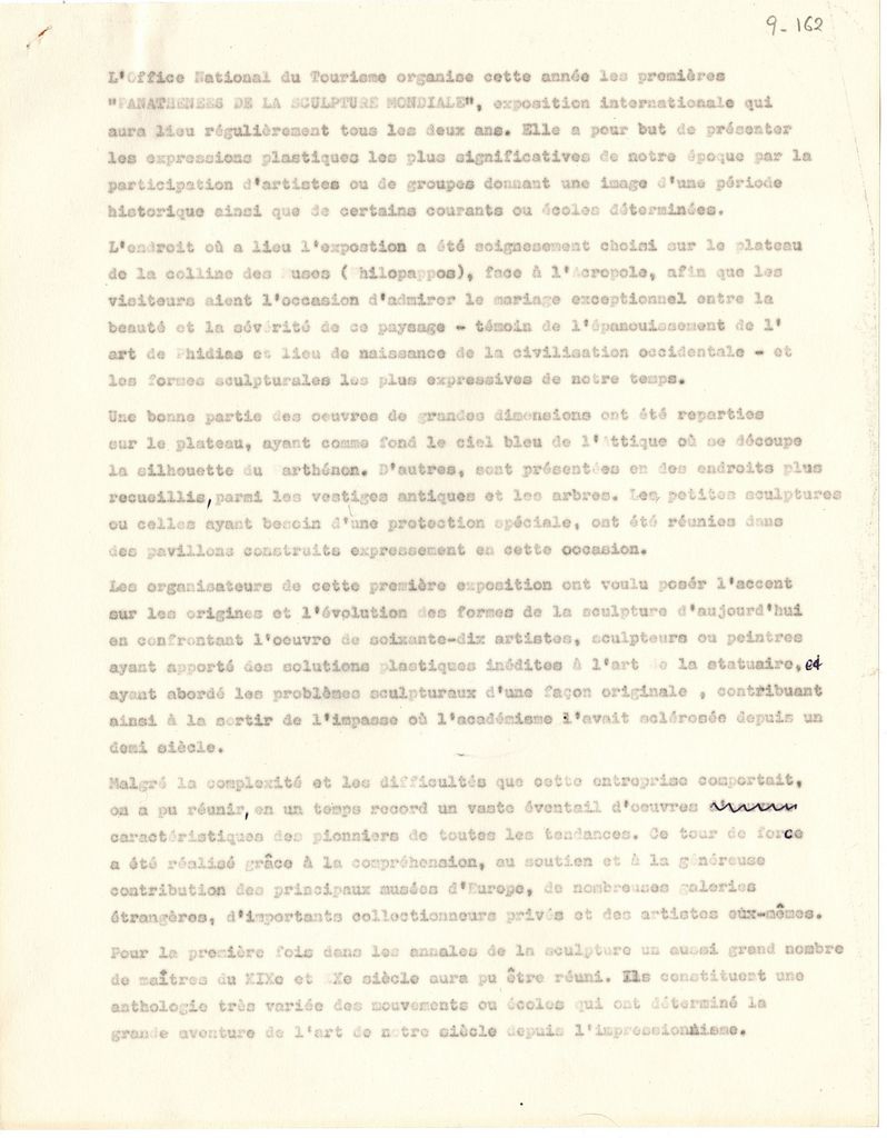Κείμενο, χειρόγραφο, με μολύβι, στα γαλλικά, χαρτί, 27,0×21,0 εκ., του Τώνη Σπητέρης αφιερωμένο στην 1η Διεθνή Έκθεσι Γλυπτική (Παναθήναια Συγχρόνου Γλυπτικής), που διοργάνωσε στο λόφο του Φιλοπάππου το φθινόπωρο του 1965.