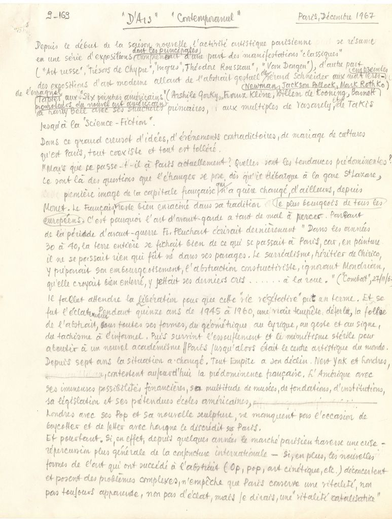 Κείμενο, χειρόγραφο, με μολύβι, στα γαλλικά, χαρτί, 3 φφ., 27,0×21,0 εκ. Προσχέδιο άρθρου του Τώνη Σπητέρη για την καλλιτεχνική κίνηση στο Παρίσι τον Δεκέμβριο του 1967. Το κείμενο προορίζεται για δημοσίευση στο περιοδικό “D’ars”.