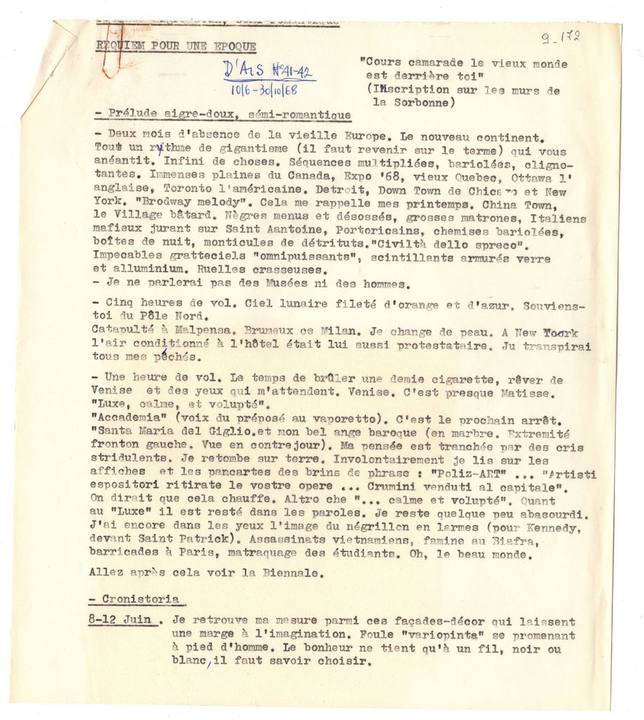Κείμενο, δακτυλόγραφο, στα γαλλικά, χαρτί, 3 φφ., 28,5×22,5 εκ.. Προσχέδιο άρθρου του Τώνη Σπητέρη για την 34η Μπιεννάλε της Βενετίας το καλοκαίρι και φθινόπωρο του 1968. Περιέχεται χρονολόγιο γεγονότων. Στο πάνω μέρος της σελίδας, επιγραφή.