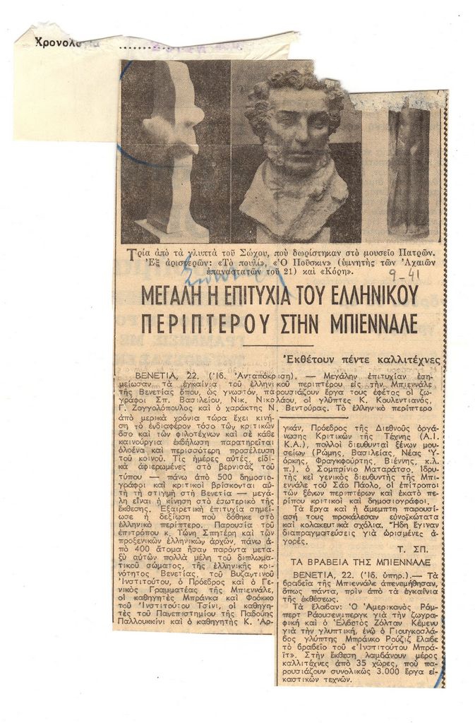 Απόκομμα, έντυπο, χαρτί, 19,0×10,5 εκ., όπου δημοσιεύεται, στα ελληνικά, άρθρο του Τώνη Σπητέρη αφιερωμένο στην ελληνική συμμετοχή στην Μπιεννάλε Βενετίας του 1964. Περιέχει πληροφορίες σχετικά με τους συμμετέχοντες καλλιτέχνες, τη διοργάνωση και τα βραβεία. Πάνω από το άρθρο εικονογράφηση που αφορά στη δωρεά τριών γλυπτών του Αντωνίου Σώχου στο Μουσείο Πατρών. Επάνω, επικολλημένο απόκομμα.
