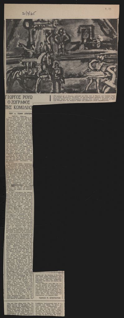 Απόκομμα, έντυπο, χαρτί, 55,0×20,0 εκ., όπου δημοσιεύεται, στα ελληνικά, άρθρο του Τώνη Σπητέρη για τη ζωή και το έργο του Γάλλου ζωγράφου Georges Rouault με αφορμή αναδρομική έκθεση έργων του που πραγματοποιήθηκε στο Παρίσι το 1965. Επάνω, επιγραφή με την ημερομηνία δημοσίευσης.