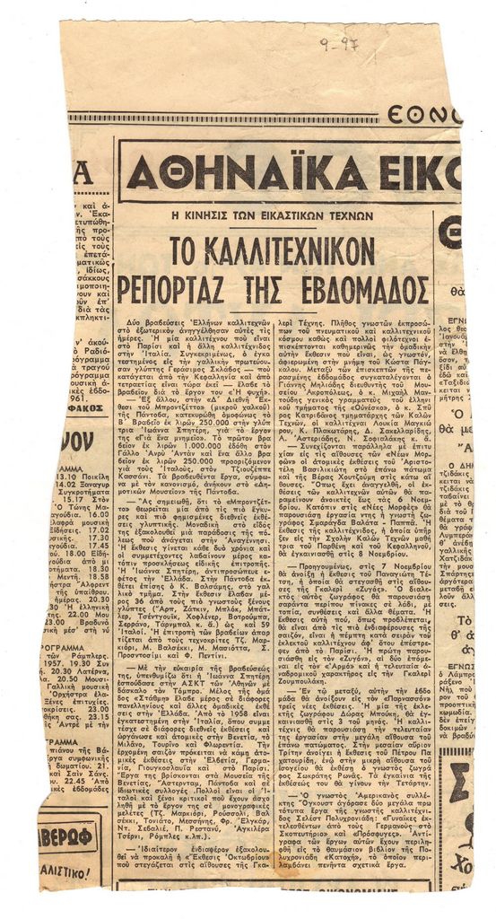 Απόκομμα, έντυπο, χαρτί, 26,5×13,5 εκ., όπου δημοσιεύεται, στα ελληνικά, ειδήσεις επικαιρότητας από τον χώρο των εικαστικών τεχνών τον Νοέμβριο του 1961 στο πλαίσιο της στήλης «Η κίνησις των εικαστικών τεχνών». Αναφέρονται η βράβευση του Γεράσιμου Σκλάβου στην Μπιενάλε των Νέων στο Παρίσι και της Ιωάννας Βεροπούλου Σπητέρη στην Δ’ Διεθνή Έκθεση του Μπροντζέττο και αναγγελίες εκθέσεων.