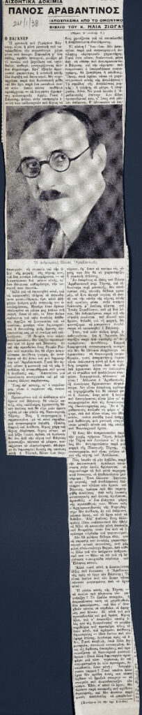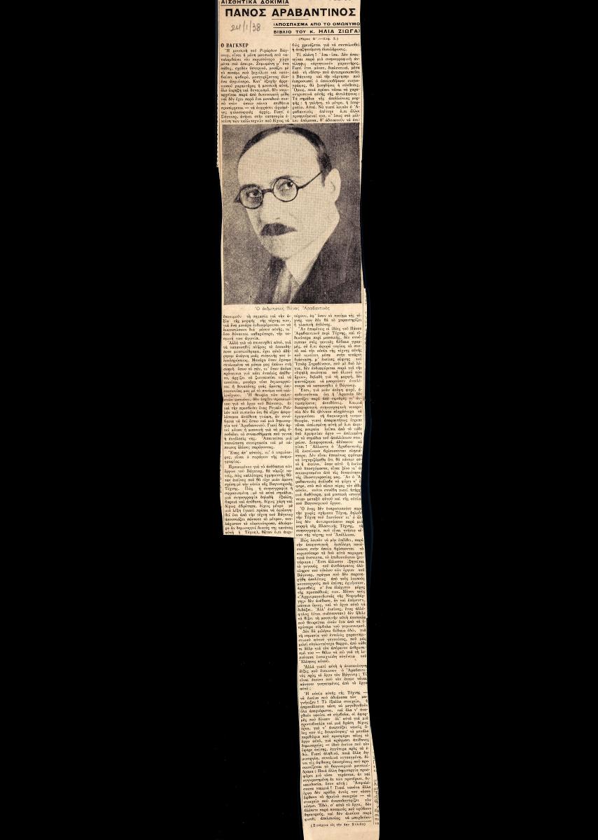 Απόκομμα εφημερίδας (24/01/1938) όπου δημοσιεύεται απόσπασμα από το ομώνυμο βιβλίο του Ηλία Ζιώγα με θέμα τη σκηνογραφική δουλειά του Πάνου Αραβαντινού.