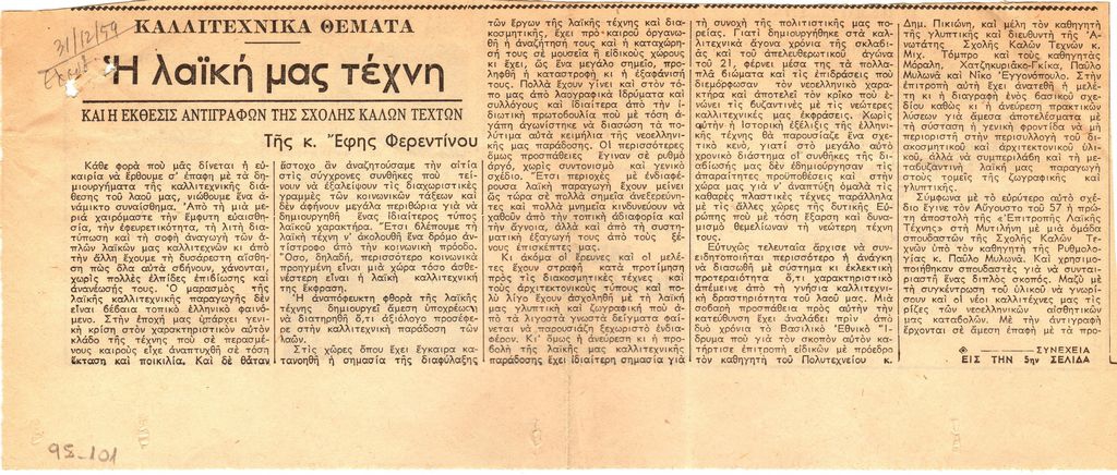 Απόκομμα, χαρτί, 2 φφ, στα ελληνικά, δημοσίευσης άρθρου αναφερόμενου στην προσπάθεια δημιουργίας αντιγράφων έργων λαϊκής Τέχνης, από επιτροπή που συστάθηκε με μέλη της ΑΣΚΤ, προκειμένου αυτά να διασωθούν και να δημιουργηθεί Μουσείο. Η επιτροπή πραγματοποίησε την πρώτη της αποστολή στη Μυτιλήνη.