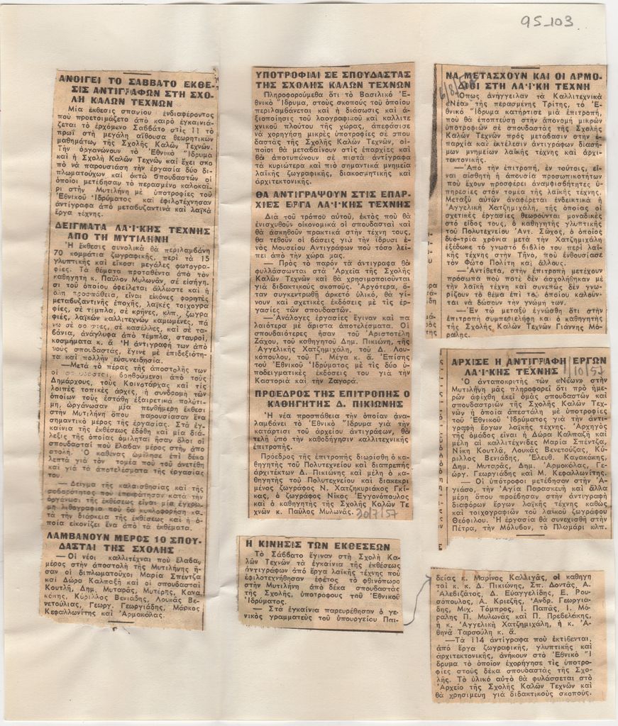 Απόκομμα, χαρτί κολλημένο σε λευκή κόλλα, στα ελληνικά, δημοσίευσης άρθρου αναφερόμενου στην έναρξη εργασιών ομάδας φοιτητών της Ανώτατης Σχολής Καλών Τεχνών στη Μυτιλήνη, για τη δημιουργία αντιγράφων έργων λαϊκής τέχνης.